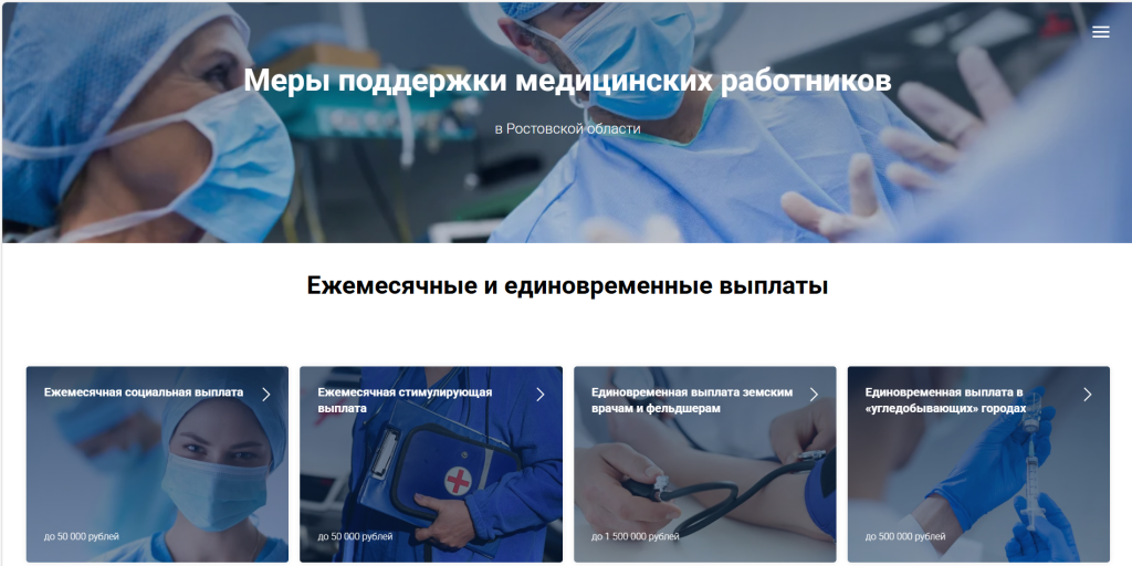 В Ростовской области реализуется ряд мер социальной поддержки медицинских работников, направленных на привлечение и закрепление медицинских кадров в субъекте, который включает следующие мероприятия.